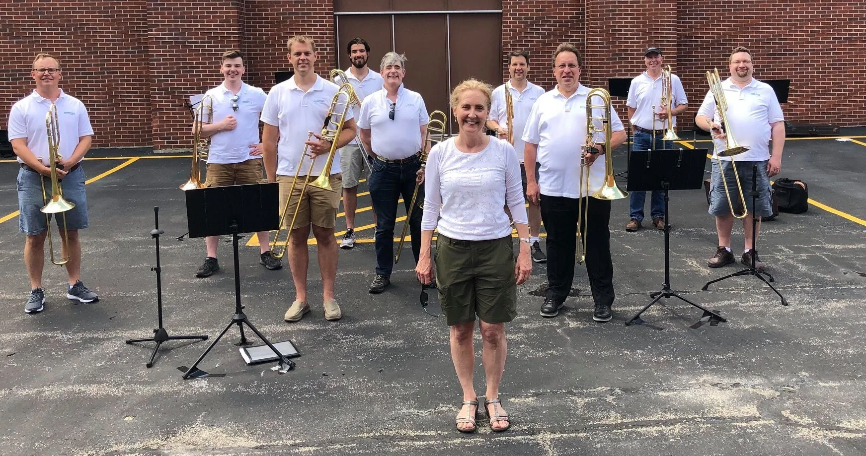 NCB trombones pose for a group photo with Artistic Director Mallory Thompson following the band’s first experiment with social distanced music making, July 2020.